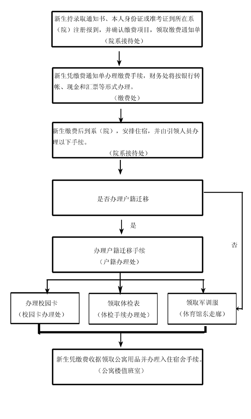 新生进校后,请按照报到流程图所示顺序办理入学手续(详见流程图)。