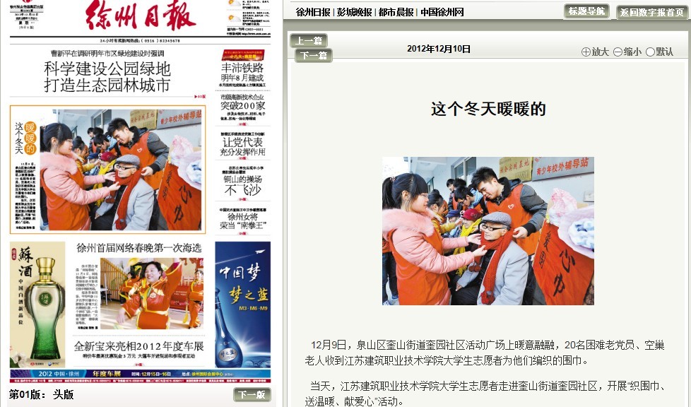 12月9日,我校志愿者带着自己亲手编织的围巾走进泉山区奎山街道奎园社区为困难老党员、空巢老师送温暖、献爱心。12月10日,《徐州日报》头版以《这个冬天暖暖的》为题,图文并茂报道了我校大学生志愿者关爱老人的志愿服务活动。