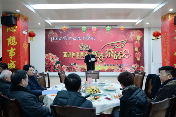 院长孙进代表学校党委和行政发表了热情洋溢的致辞,向离退休老同志多年来一直关心、支持、促进学校发展表示衷心的感谢,向老同志们致以新年的诚挚问候。孙进向与会老同志全面通报了学校过去一年来的事业发展情况,重点介绍了我校在江苏省高职院校人才综合竞争力排名第5、在江苏省品牌专业建设申报中获得A+B、在全国现代学徒制专业中获得首批试点,在国家级资源库建设中成功立项,在师资队伍建设中取得明显提升、在各级各类全国职业技能竞赛中斩金夺银、在科研项目推进中上了大台阶、在招生就业方面实现稳中有进、在国际化办学取得明显突破等显著成绩,对学校“十三五”期间事业发展进行了展望,祝福全体老同志们身体健康、家庭幸福。