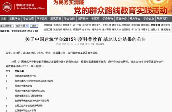 3月16日,中国建筑学会网站发布2015年度科普教育基地认定结果公告,正式认定我校为“中国建筑学会科普基地”。