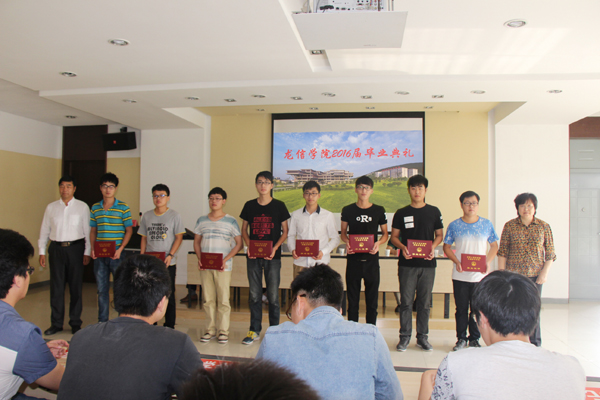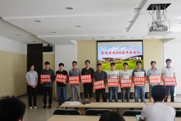 孙进院长和卞勤华主席共同为毕业生代表颁发毕业证书,并对2015-2016年度20名龙信奖学金和助学金获得者进行了表彰。