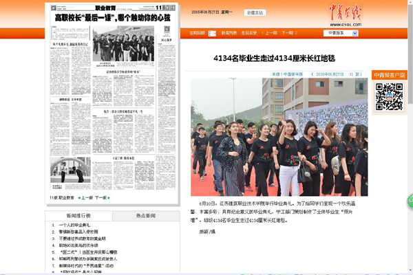 6月27日,《中国青年报》11版以《4134名毕业生走过4134厘米长红地毯》图文并茂报道了我校毕业典礼。同时,《中国教育报》职业教育版官方微信“青鲁班”以《高职校长“最后一课”,哪个触动了你心弦?(第三期)》发布了我校院长孙进在毕业典礼上的讲话。