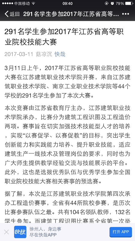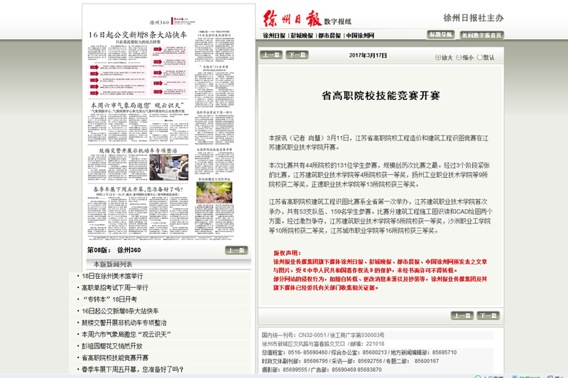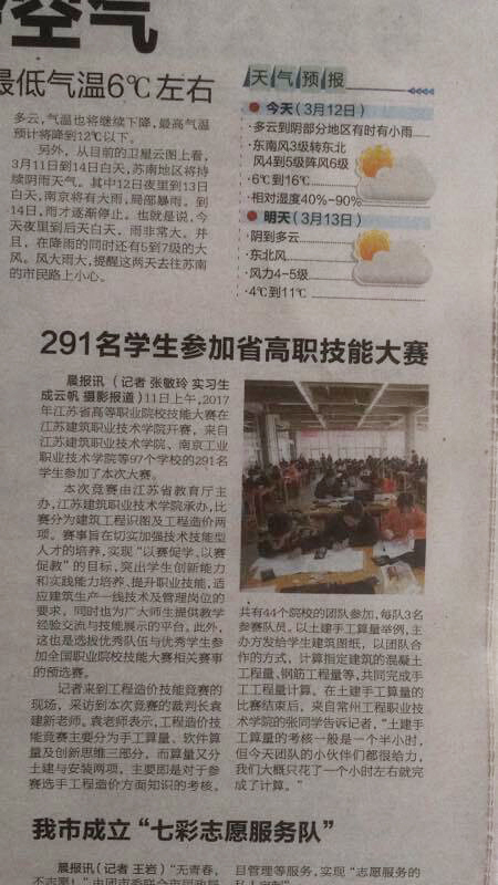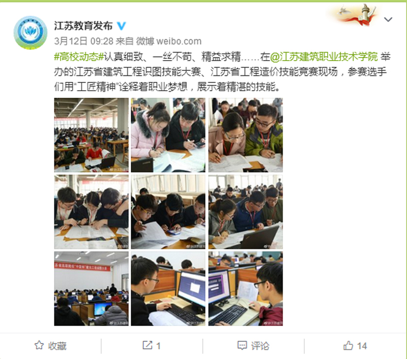 3月11日,由省教育厅主办,广联达软件股份有限公司、中望龙腾软件股份有限公司冠名协办的2017年江苏省高职院校“广联达杯”工程造价技能竞赛、“中望杯”建筑识图与绘图技能竞赛在我校成功举办。江苏省教育厅官方微博《江苏教育发布》,徐州地方媒体《徐州日报》、《都市晨报》、《快哉APP》关注了两项大赛。