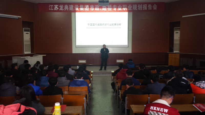 能源与交通工程学院“成长之路”系列校友讲坛第二讲——“龙典集团职业规划报告会”于3月21日在招聘大厅多厅二隆重举行,道路桥梁工程技术专业04-4班毕业生、江苏龙典建设集团有限公司项目经理褚忠海校友及陈林林经理为路桥15级、市政专业同学做专题报告会。报告会由学院院长戚豹老师主持,建筑设备与市政工程学院副书记龚媛媛、白建国等老师参加了报告会。