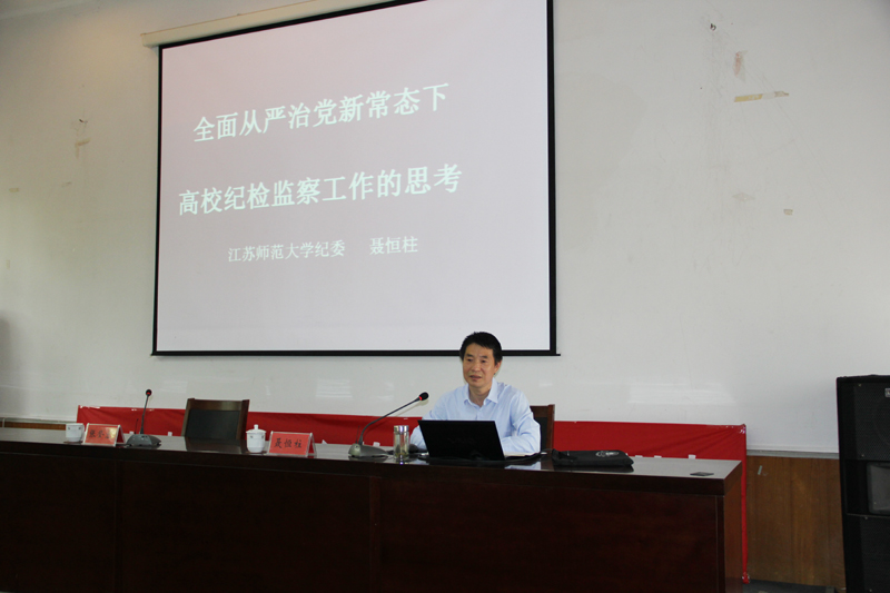 江苏师范大学纪委副书记、监察处处长聂恒柱应邀作了“全面从严治党新常态下高校纪检监察工作的思考”专题报告。他分析了高校纪检监察工作面临的形势和主要任务,并结合实际分享了纪检监察工作实践和思考,指出纪检监察干部要当好“教导员、安检员、督导员和示范员”。