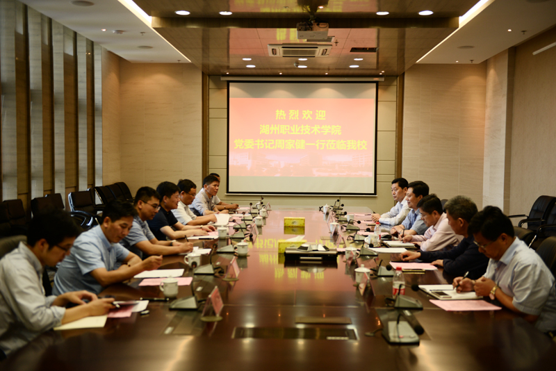 座谈会在图书馆会议室举行。会上,吴光林书记向客人详细介绍了办学特色、办学成就及定位。湖州职业技术学院党委书记周家健充分肯定了我校的办学成就,并向我校介绍了湖州职业技术学院的办学情况。