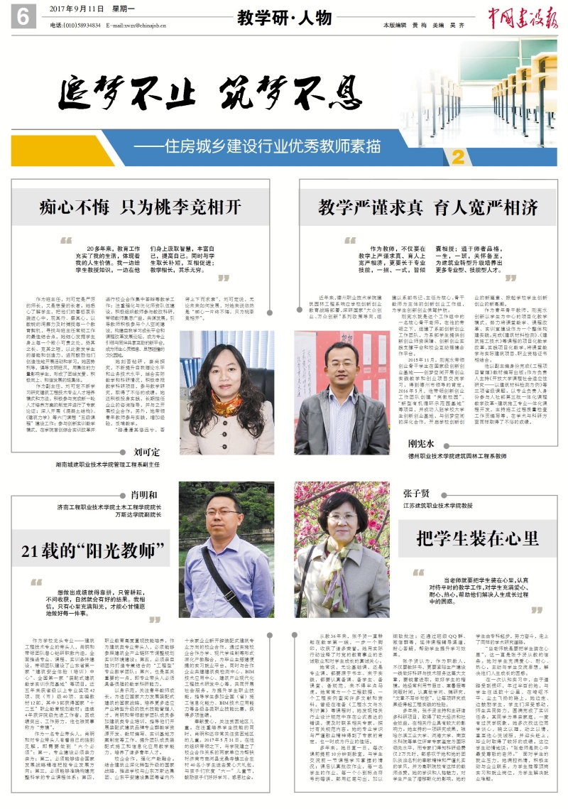 9月11日6版《中国建设报》以《把学生装在心里》为题,报道了我校设备学院张子贤老师关注、关心、关爱学生成长事迹。