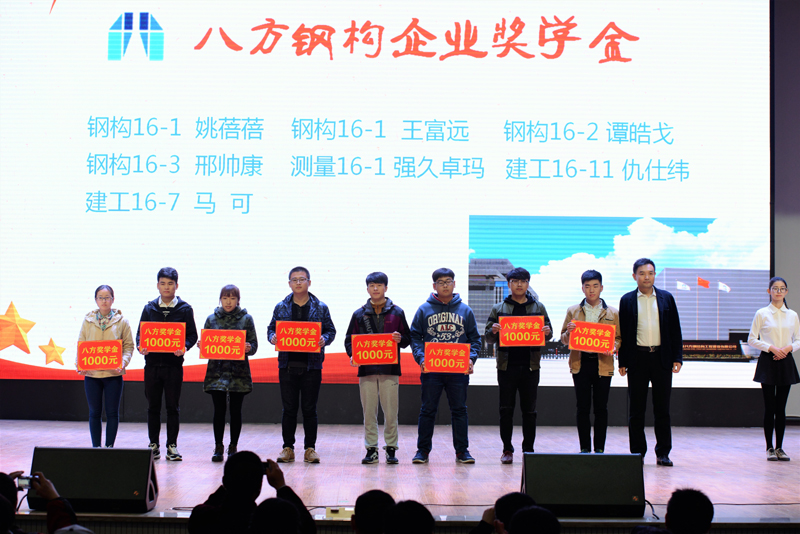利用学生表彰季,大力表彰企业励志奖学金获奖同学。在学院2017年秋季表彰大会上分别对“中南奖学金”“龙信奖学金”“八方钢构奖学金”等42名获奖学生进行表彰。江苏八方钢结构工程建设有限公司王军董事长作为特邀嘉宾给获奖同学颁奖。通过表彰先进,为学生树立了学习榜样,激励广大学生更加努力学好知识,练好技能,服务社会。
