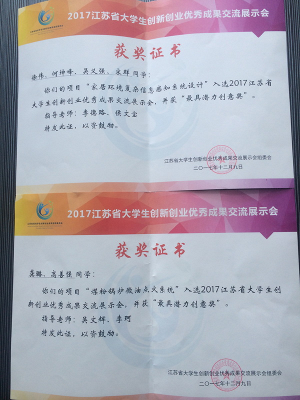 12月8日至10日,由江苏省高校学生创新创业教育指导委员会主办,南京工业大学承办,南京江北新区协办的2017年江苏省大学生创新创业优秀成果交流展示会暨江苏省高校学生创新创业教育指导委员会年会在南京召开,我校选报的由龚璐、王金阳等同学主持的《粉锅炉微油点火系统》,徐伟、何坤峰等同学主持的《家居环境复杂信息感知系统设计》两个展示项目荣获“最具潜力创意奖”。