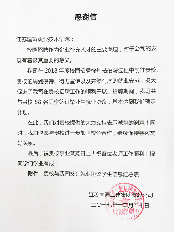 近日,我校建工学院收到一封来自江苏南通二建集团有限公司的感谢信。信中,该公司对建工学院精心组织、周密安排招聘工作,热情服务用人单位表示称赞,对招聘到58名满意毕业生表示感谢,同时希望进一步开展校企合作,建立长期的合作关系。