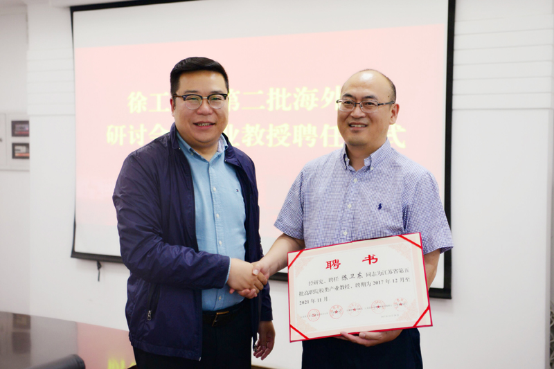 研讨会上,刘海波副院长向李戈首席技师颁发我校产业教授聘书,并代表江苏省人才办等5个厅局向陈卫东总经理颁发江苏省产业教授聘书。