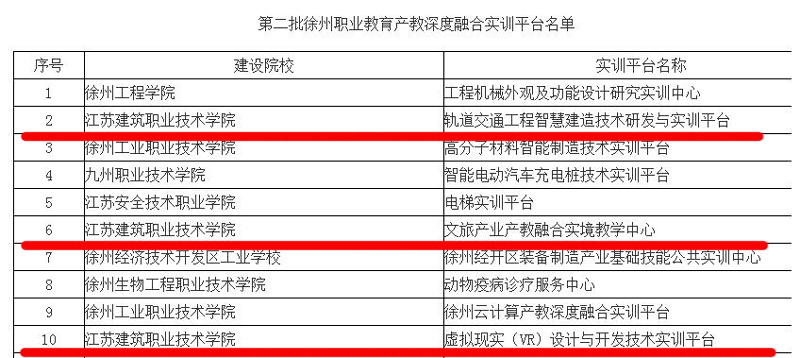 近日,根据《关于公布第二批面向徐州战略产业的特需专业领办院校、产教融合实训平台认定结果的通知》(徐教职﹝2018﹞19号),徐州市教育局发布认定我校为第二批特需专业——“数字媒体应用技术”专业的领办院校;认定我校“轨道交通工程智慧建造技术研发与实训平台”“文旅产业产教融合实境教学中心”“虚拟现实(VR)设计与开发技术实训平台”为徐州职业教育产教深度融合实训平台。