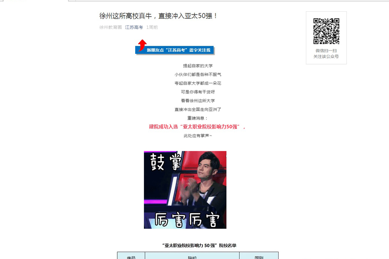 近日,我校荣膺“亚太职业院校影响力50强”,开学典礼、毕业30周年校友返校活动等受到江苏高考微信号关注。