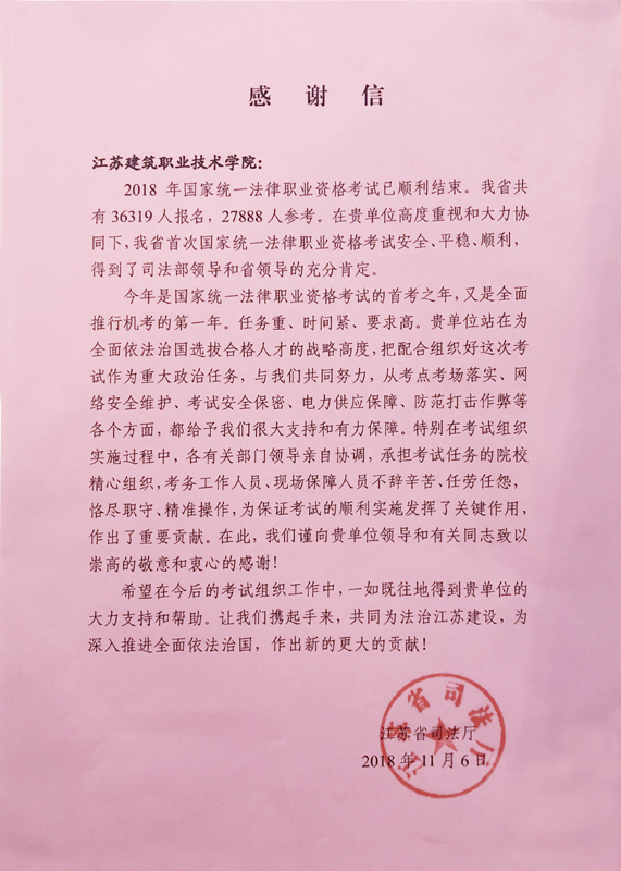 近日,江苏省司法厅给我校发来感谢信,充分肯定了我校作为2018年国家统一法律职业资格考试承办单位,积极配合江苏省司法厅做好徐州考区考务工作,为考试提供了坚强有力的保障。