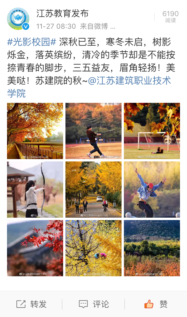 时至深秋,苏建院校园内美景如织,受到“江苏教育发布”等多家媒体的关注。