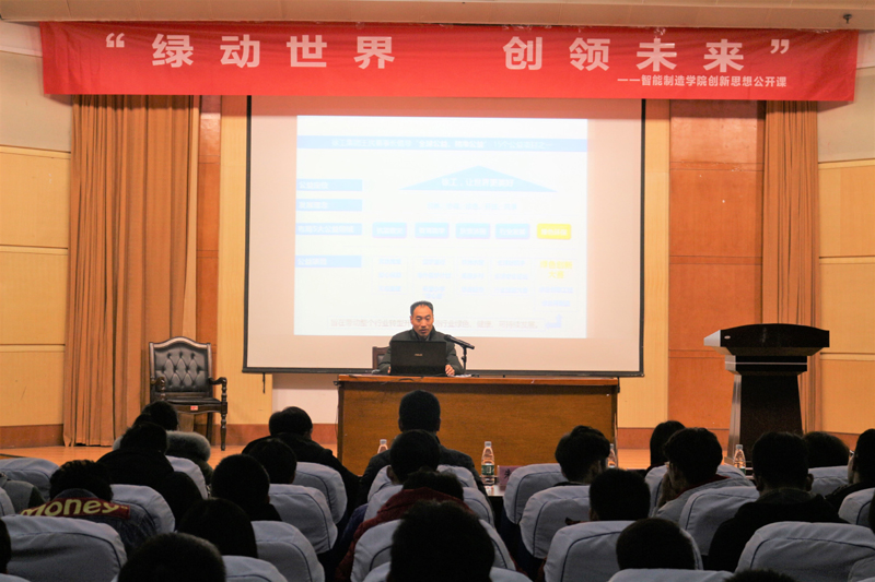 12月25日下午,智能制造学院在学术报告厅举办绿色创新思想公开课。本次的创新思想公开课以“绿动世界创领未来”为主题,邀请了徐工集团技术专家朱磊、孙凤霞、李长青、雷许为300余名师生上了一堂生动的绿色创新课程。