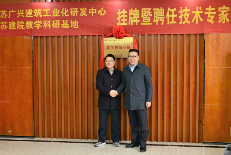 我校刘海波副院长、江苏广兴集团王广经总经理共同为我校与江苏广兴集团合作的建筑工业化研发中心和我校教学科研基地揭牌,建造学院王军强教授受聘为建筑工业化研发中心技术专家,王广经为王军强颁发聘书。