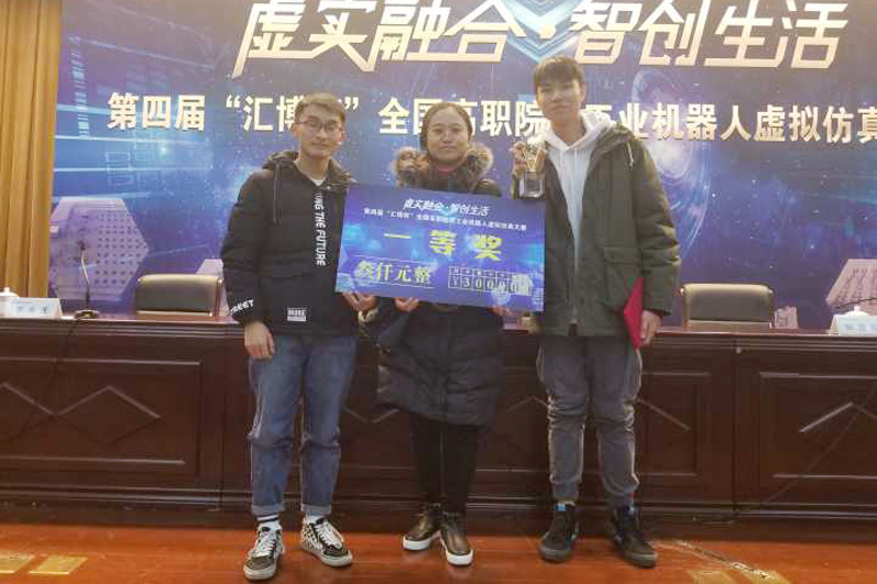近日,第四届“汇博杯”全国高职院校工业机器人虚拟仿真大赛在常州市举行,由我校智能制造学院李姗姗老师,机器人17-1班陈键、梁毅凯两位同学组成的师生团队参加了工业机器人系统虚拟调试赛项比赛,获该赛项一等奖。