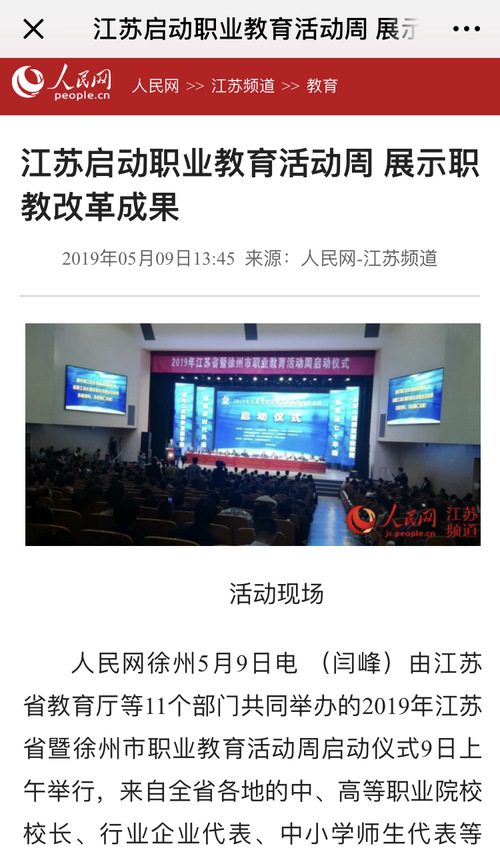 由江苏省教育厅等11个部门共同举办的2019年江苏省暨徐州市职业教育活动周启动仪式9日上午举行,来自全省各地的中、高等职业院校校长、行业企业代表、中小学师生代表等700余人参加了启动仪式。作为展示职业教育改革发展成果,促进教育、产业和社会各界融合的重要平台,职业教育活动周将全方位展示职业教育取得的新成果、新成就、新贡献。
