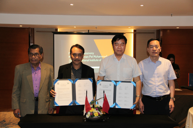 6月19日晚,在印尼教育部的精心安排下,我校代表团在入住宾馆会议厅与印尼默罕默迪亚教育联盟举行了隆重的签约仪式。印度尼西亚默罕默迪亚联盟是印尼最大的全国性教育联盟,联盟内有500所理工学院,5754所学校,是一个致力于文化交流,教育培训的非政府组织。座谈中,孙进详细介绍了江苏及徐州的历史文化、学校的办学情况及国际化战略,并代表学校分别与默罕默迪亚教育联盟及艾哈迈德·达兰大学签署框架合作备忘录。联盟理事长、艾哈迈德·达兰大学校长卡斯亚诺出席签约仪式并致欢迎辞,他表示联盟内的32名高中校长和教育督导参加了我校3月份承办的印尼师资培训项目,他们对我校承办的培训盛赞有加,对江苏徐州及我校的办学实力留有深刻印象,参加中国培训项目成员已经将在中国的所见所闻及培训心得编著成系列书籍,即将付梓出版发行。他希望联盟能与江苏建院保持长久、持续的合作关系,为印尼教育及校长、教师能力培养搭建坚实平台。