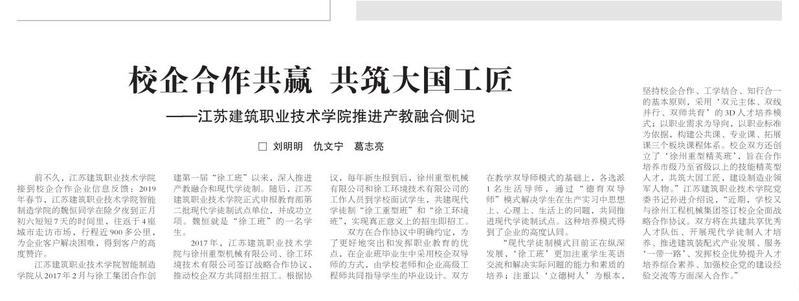 2017 年,开云在线平台与徐州重型机械有限公司、徐工环境技术有限公司签订战略合作协议,推动校企双方共同招生招工。根据协议,每年新生报到后,徐州重型机械有限公司和徐工环境技术有限公司的工作人员到学校面试学生,共建现代学徒制“徐工重型班”和“徐工环境班”,实现真正意义上的招生即招工。双方在合作协议中明确约定,为了更好地突出和发挥职业教育的优点,在企业班毕业生中采用校企双导师的方式,由学校老师和企业高级工程师共同指导学生的毕业设计。双方在教学双导师模式的基础上,各选派1 名 生 活 导 师 , 通 过 “ 德 育 双 导师”模式解决学生在生产实习中思想上、心理上、生活上的问题,共同推进现代学徒制试点。这种培养模式得到了企业的高度认同。