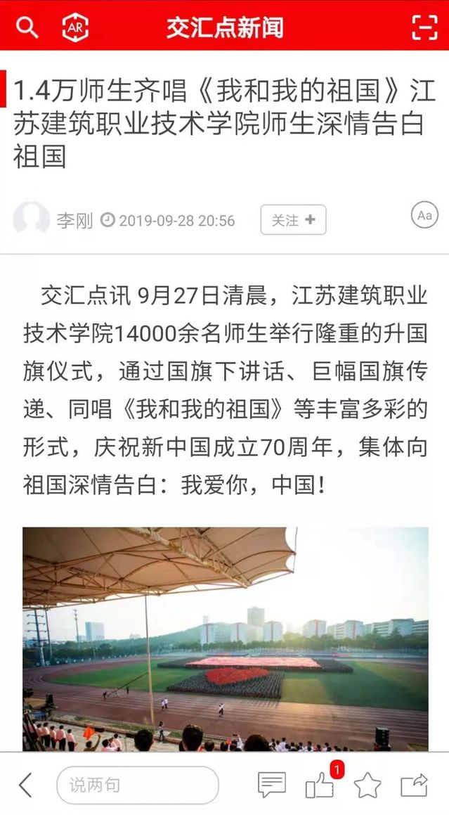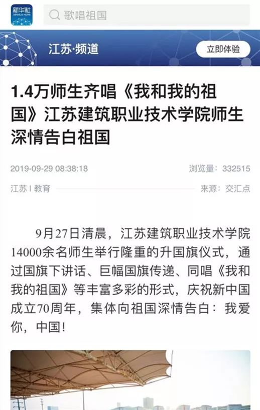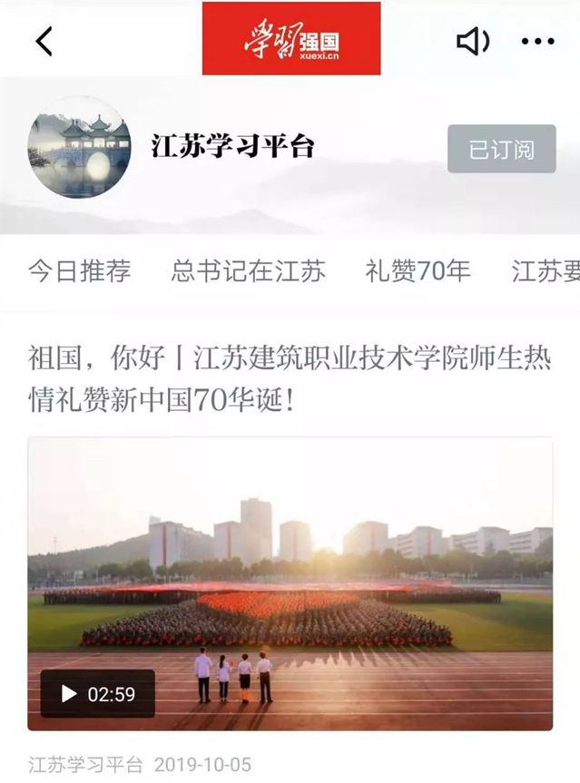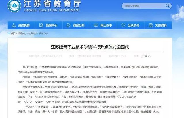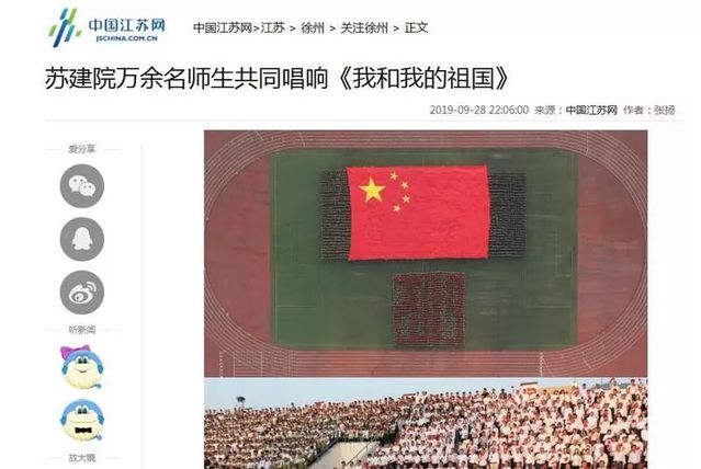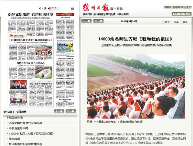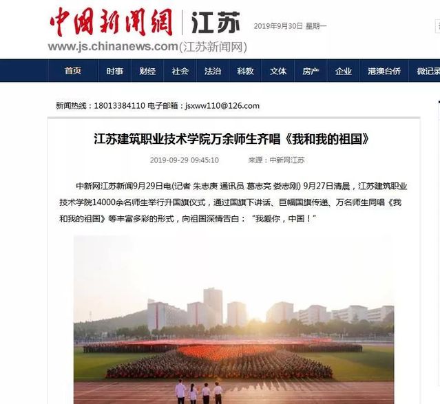 近日,学习强国、人民网、新华社、中新网、中青网、中工网、交汇点、中江网、江苏电视台、荔枝网、江苏省教育厅网站、徐州日报、徐州电视台等媒体聚焦苏建院,庆祝新中国成立70周年升旗仪式,为我们转发、点赞!