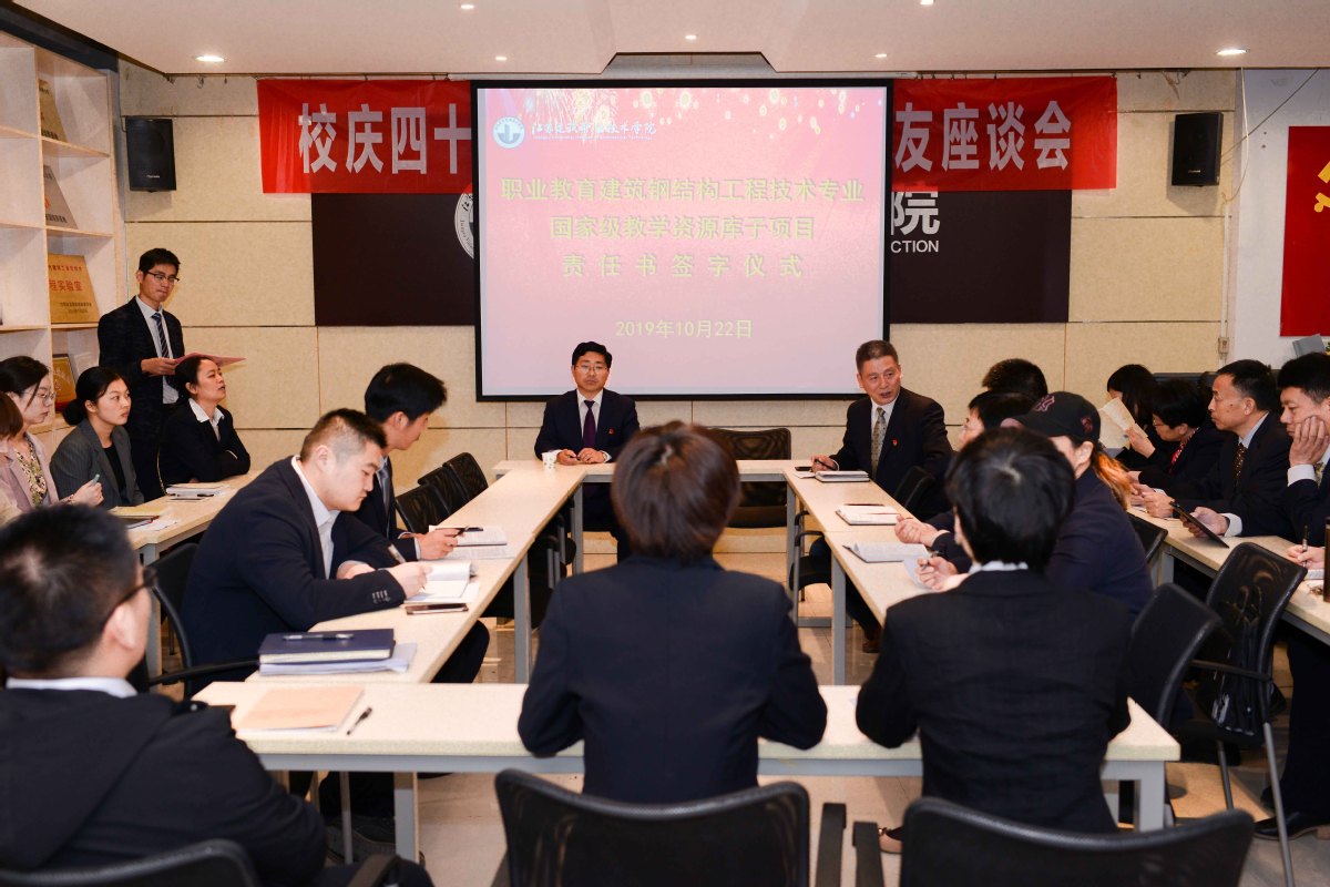 10月22日,建筑钢结构工程技术专业国家教学资源库建设子项目责任书签字仪式在我校利亚楼会议室举行。院长沈士德教授与9位子项目负责人逐一签订责任书,建筑建造学院全体教师参加了仪式。