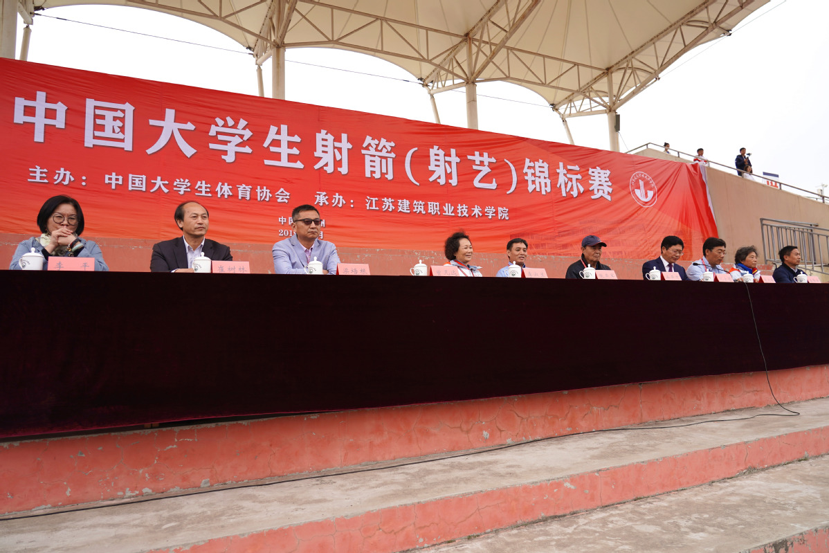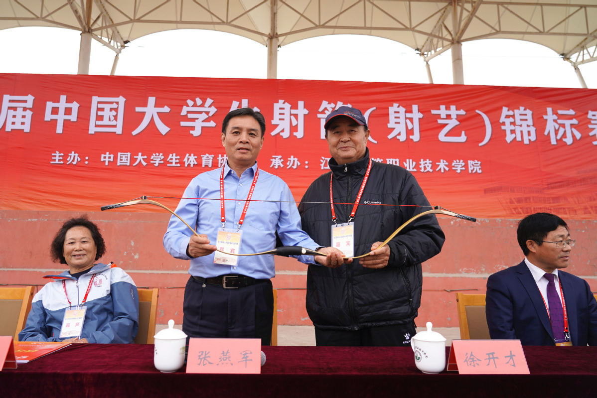 开幕当天,原国家射箭集训队总教练、中国射箭协会教练委员会主任、中国射箭协会传统弓分会荣誉主席徐开才,中国射箭协会副主席、原国家射箭集训练队教练、中国射箭协会传统弓分会荣誉主席李淑兰,中国大学生体育协会常务理事张燕军,中国大学生体育协会竞赛部项目主管张玉龙,江苏省学生体协高校工作委员会秘书长张天峰,江苏省高职体育教学指导委员会主任梁培根等大赛特邀嘉宾莅临我校,参与了“赠弓仪式”等相关环节。