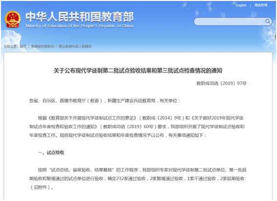 10月24日,教育部发布了《关于公布现代学徒制第二批试点验收结果和第三批试点检查情况的通知》(教职成函[2019]97号)。我校现代学徒制三个项目顺利通过验收,这标志着我校在现代学徒制试点项目上又取得一项重大成果。