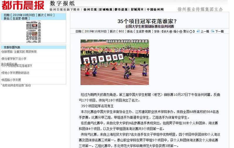 传统弓比赛,来自上海经贸大学的7名女选手在女子甲组中优势明显,四个项目中获团体和个人淘汰赛及团体排名赛三项第一。泰山职业学院在男子甲组5个项目中,获个人和团体淘汰赛及个人排名赛三项第一。乙组比赛中,东北师范大学和华南师范大学各获得3项第一。