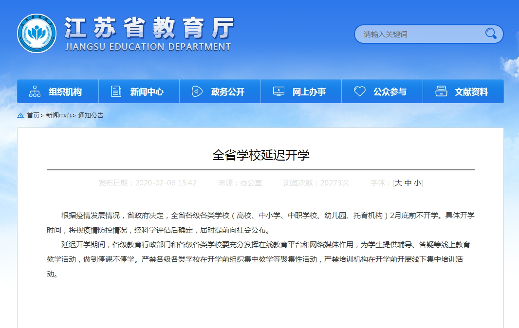 根据江苏省教育厅统一要求,各高校2月底前不得开学。学校开学时间需经上级教育主管部门和学校疫情防控工作领导小组视疫情防控情况做出科学评估,确定后向师生公布。