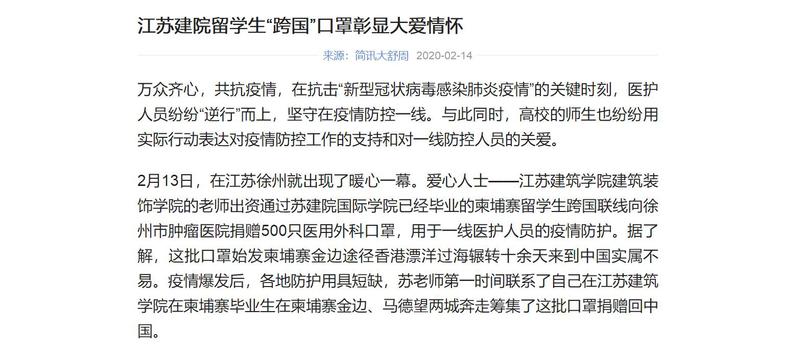 2月13日,在江苏徐州就出现了暖心一幕。爱心人士——江苏建筑学院建筑装饰学院的老师出资通过苏建院国际学院已经毕业的柬埔寨留学生跨国联线向徐州市肿瘤医院捐赠500只医用外科口罩,用于一线医护人员的疫情防护。据了解,这批口罩始发柬埔寨金边途径香港漂洋过海辗转十余天来到中国实属不易。疫情爆发后,各地防护用具短缺,苏老师第一时间联系了自己在江苏建筑学院在柬埔寨毕业生在柬埔寨金边、马德望两城奔走筹集了这批口罩捐赠回中国。