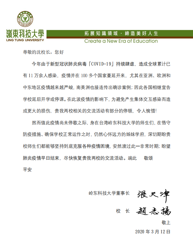 3月12日,台湾岭东科技大学董事长张天津和校长赵志扬发来慰问函,对因新型冠状肺炎疫情而暂停的两校交流表示惋惜,并代表全校师生祝福我校早日克服疫情困境,期盼两校恢复正常交往。