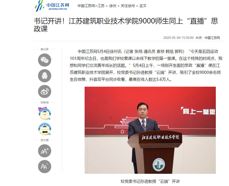 中国江苏网5月4日徐州讯(记者 张扬 通讯员 袁祯 韩旭 郭利)“今天是五四运动101周年纪念日,也是我们学校复课以来线下教学的第一堂课。在这个特殊的时间点,我想和同学们交流青年成长的话题。”5月4日上午,一场别开生面的思政“直播”课在开云在线平台展开,校党委书记孙进教授“云端”开讲,吸引了全校9000余名师生在微赞、抖音双平台同步收看,最高在线人数达5.6万人。