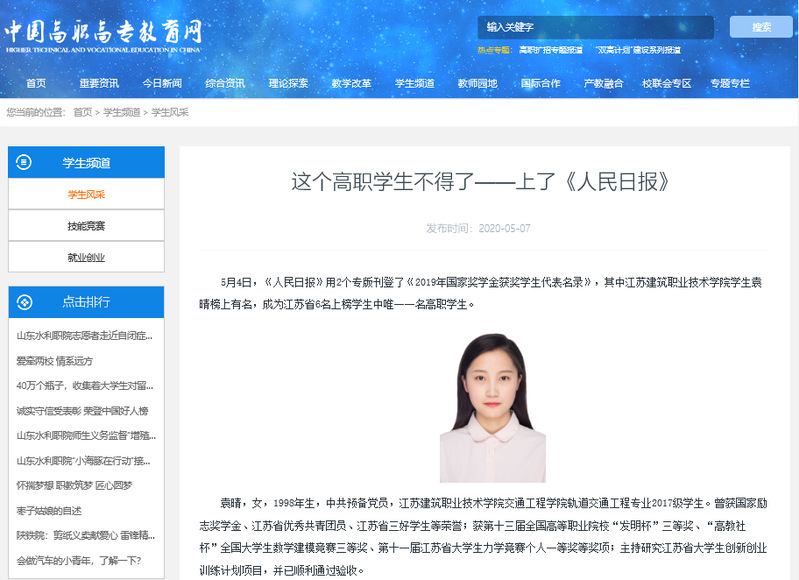 5月4日,《人民日报》用2个专版刊登了《2019年国家奖学金获奖学生代表名录》,其中开云在线平台学生袁晴榜上有名,成为江苏省6名上榜学生中唯一一名高职学生。