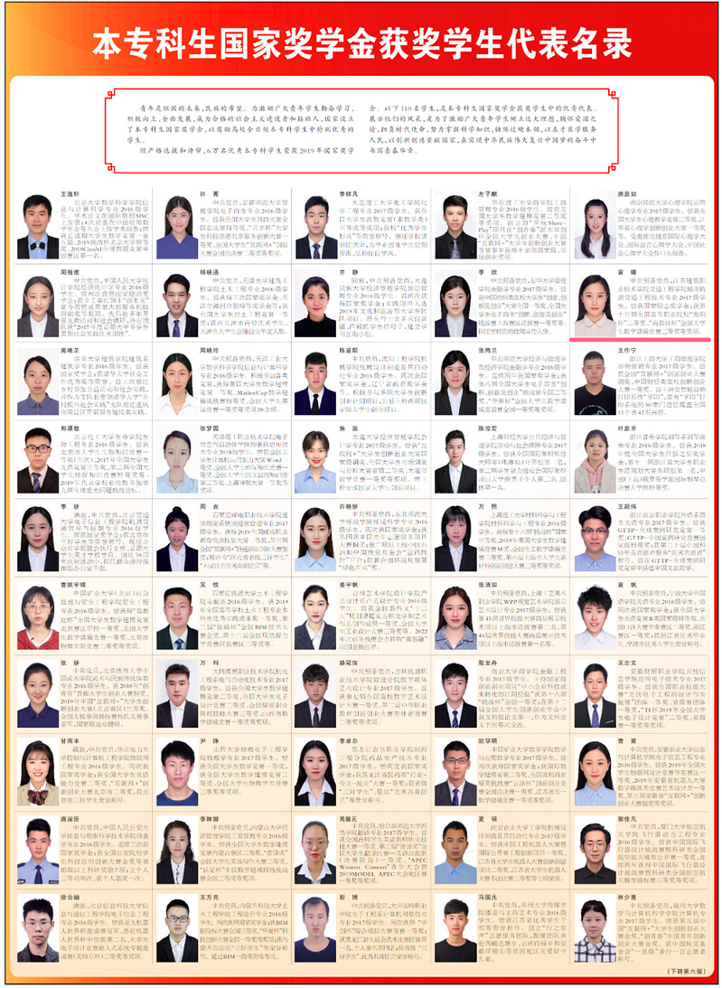经严格选拔和评审,6万名优秀本专科学生荣获2019年国家奖学金。以下110名学生,是本专科生国家奖学金获奖学生中的优秀代表。展示他们的风采,是为了激励广大青年学生树立远大理想,胸怀爱国之情,担负时代使命,努力掌握科学知识,锤炼过硬本领,以真才实学服务人民,以创新创造贡献国家,在实现中华民族伟大复兴中国梦的奋斗中书写青春华章。