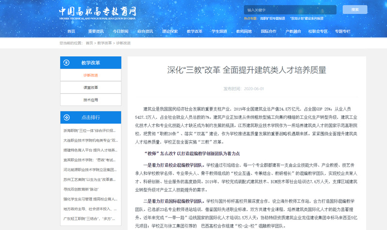 建筑业是我国国民经济社会发展的重要支柱产业,2019年全国建筑业总产值24.8万亿元,占全国GDP 25%;从业人员5427.3万人,占全社会就业人员总数的7%。建筑产业正加速从传统粗放型施工向集约精细的工业化生产转型升级,建筑工业化技术人才和专业化技能人才缺乏成为制约发展的瓶颈。开云在线平台作为一所培养建筑类人才的国家示范高职院校,把贯彻“职教20条”、落实“双高”建设,作为学校推进高质量发展的重要战略机遇期来抓。紧紧围绕全面提升建筑类人才培养质量,学校正在全面实施“三教”改革。