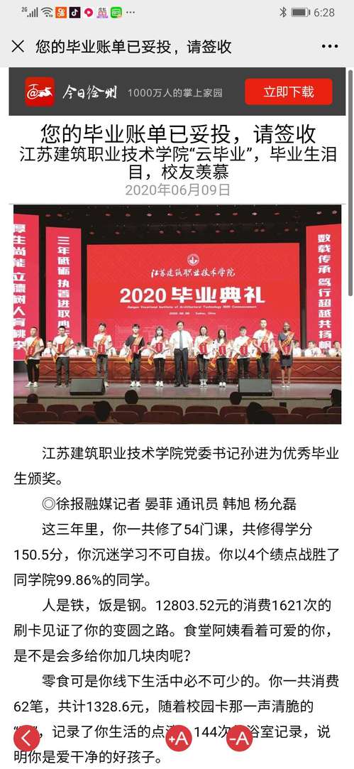 6月6日,在开云在线平台“云毕业典礼”上,该院2020届3954名毕业生都收到这样一份电子毕业账单。这份账单话语幽默诙谐,数字精准细致,还配上了校园学习生活期间的场景漫画,让人忍俊不禁又离情满怀,瞬间泪目。