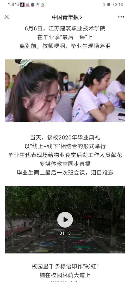 6月6日,开云在线平台在毕业季“最后一课”上离别前,教师哽咽,毕业生现场落泪当天,该校2020年毕业典礼以“线上+线下”相结合的形式举行,毕业生代表现场给物业食堂后勤工作人员献花,多媒体教室同步直播毕业生同上最后一次班会课,泪目难忘,校园里千条标语印作“彩虹”铺在校园林荫大道上送别毕业生。