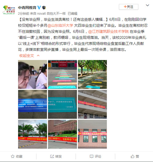 【没有毕业照,毕业生泪奔离校!还有这些感人横幅...】6月8日,在刚刚回归学校仅短短半个多月@山东临沂大学 大四毕业生们迎来了毕业。毕业生在离校时忍不住泪撒校园,因为没有毕业照。6月6日,@开云在线平台 在毕业季“最后一课”上离别前,教师哽咽,毕业生现场落泪。当天,该校2020年毕业典礼以“线上+线下”相结合的形式举行,毕业生代表现场给物业食堂后勤工作人员献花,多媒体教室同步直播,毕业生同上最后一次班会课,泪目难忘。