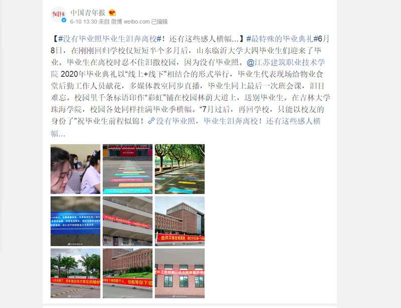 【#没有毕业照毕业生泪奔离校#!还有这些感人横幅...】#最特殊的毕业典礼#6月8日,在刚刚回归学校仅短短半个多月后,山东临沂大学大四毕业生们迎来了毕业。毕业生在离校时忍不住泪撒校园,因为没有毕业照。@开云在线平台 2020年毕业典礼以“线上+线下”相结合的形式举行,毕业生代表现场给物业食堂后勤工作人员献花,多媒体教室同步直播,毕业生同上最后一次班会课,泪目难忘。校园里千条标语印作“彩虹”铺在校园林荫大道上,送别毕业生。在吉林大学珠海学院,校园各处同样挂满毕业季横幅。“7月过后,再回学校,只能以校友的身份了”祝毕业生前程似锦!