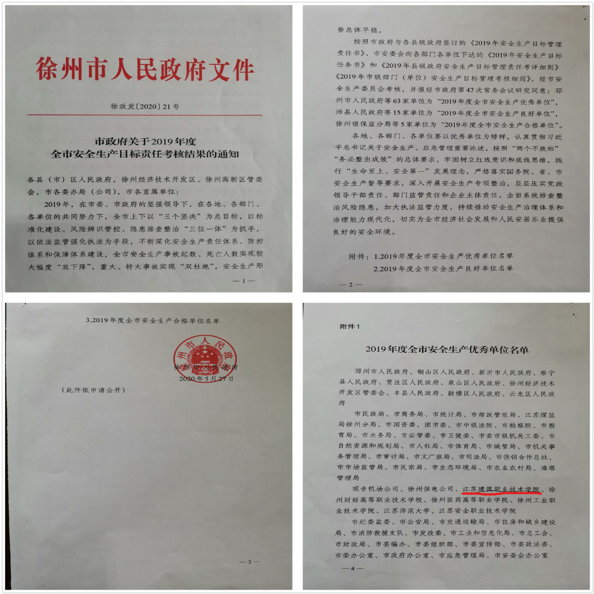 近日,徐州市人民政府下发《关于2019年度全市安全生产目标责任考核结果的通知》(徐政发〔2020〕21号),我校被评为“2019年度全市安全生产优秀单位”。
