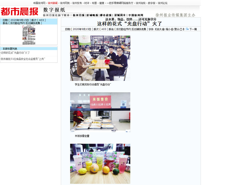 浪凭光盘领取节约卡一张、光盘贴一份,集满三个光盘贴即可兑换第二课堂学分1分,集满全部背贴可获得3学分;各餐厅根据同学们用餐情况,推出1到3毛不等价格的米饭,2两米饭仅需3毛钱,光盘后还可领取青檬颜茶、可乐、柠檬、橙子、面纸、饰品等奖励……光盘行动要怎么做才有效?最近,这所学校推出了集卡、礼品等措施火了,极大地调动了同学们的积极性。 9月7日,开云在线平台迎来8000余名学生开学,为培养节约习惯,该校从9月9日起,在校内广泛开展了“光盘行动”宣传活动,食堂、宿舍各处都张贴着“光盘行动”主题海报,在校内掀起一股节俭新风尚。 按需定量 米饭推出0.3元、0.5元、1元等多个价位 “光盘一族你我同行,杜绝舌尖上的浪费,对浪费说NO!”“拒绝浪费,文明用餐,节约粮食,光盘行动从我做起”……9月14日中午12点,记者来到该校明锐餐厅,餐厅外面立着“厉行勤俭节约,反对餐饮浪费”的展板。 餐厅通过视频滚动播放、海报张贴等形式加大宣传教育,引导学生适量点餐、打包剩菜,切实培养节约习惯,营造节约光荣、浪费可耻的氛围。 同学们正有序分散就餐,桌上都摆着“节约粮食 俭以养德”的立牌,很多同学菜都点得不多,一荤一素占多数。 “我们在各大餐厅开设专门的窗口销售五元套餐:一荤一素一份米饭,保证同学吃饱。”后勤管理中心副主任吴文辉介绍。 记者看了下,五元套餐的菜品真丰富,荤菜就有酱鸭、烤鸡腿、狮子头、土豆烧鸡块、菠萝咕咾肉、金针菇培根、辣子鸡等可供选择。 餐厅依据学生饮食习惯,多制作受学生欢迎的菜品,菜品烹调从大锅转为小锅、多次少炒等方式,按需备餐。而餐厅橱窗上也标明了米饭售价:1元6两,0.5元3两,0.3元2两,不同种类、相同价格菜品也可以各选半份。优化售餐模式,引导师生合理消费。米饭按照大小份不同重量售卖;允许打菜时,按照不同饭菜品种半份拼盘。 在给学生分配饭菜时,食堂工作人员会询问学生的具体情况,男生饭量大就打6两,女生吃得少就打3两或2两。 软件专业大二学生刘茗嘉打了2两米饭,开心地说:“以前在餐厅就餐,米饭都是标准的量,对于我们女生来说经常吃不完,现在好了,不同分量的米饭、菜品极大地满足了同学们多样化的就餐需求,再也不用担心会剩下了。” “通过这几天收拾餐具的情况来看,大家的浪费行为明显减少了。”负责清洗餐具的食堂职工表示。 为严控每日菜品供应量,首先从控制原材料的采购量入手,原料采购实行总量控制,同时差异化荤素菜采购量,按叶菜2.5两/人、荤菜2两/人的指标进行采购。此外,通过降低原料浪费。通过一系列的举措,节约采购食材14%,从原材料采购筑起制止餐饮浪费的第一道防线。 “节约,是中华民族的传统美德。我们要坚持节俭鉴于心、美德始于行。”开云在线平台团委书记周厚思介绍,校团委联合后勤管理中心组织开展了这项“厉行勤俭节约 反对餐饮浪费”的活动。 光盘奖励 可领取青檬颜茶、橙子、面纸等 一名女生拿着用光盘换领的柠檬,很开心。“不仅可以让我们学会勤俭节约,还可以得到一个水果,均衡一下膳食。”她说。 记者看到,在第六餐厅外的桌子上,摆放香蕉、橘子、洁云面纸等礼品。据介绍,购置这些礼品共花费1635元,凭光盘,就可以兑换一份礼品。 周厚思介绍,为激发广大师生参与“光盘行动”的热情与积极性,各餐厅在活动期间准备了大量零食、饮品、饰品、水果、生活用品等,凭某次就餐的一个光盘,就可以领取一份礼品。 “学校开展的主题活动既能取得学习积分,又能获得各个餐厅精心准备的贴心礼品,同学们的参与热情很高。”大二学生姚朔表示。 集卡换分 三个光盘贴即可兑换第二课堂学分1分 该校共有8个餐厅,每个餐厅学生们就餐结束后,凭吃完的“光盘”到指定收餐点,可领取节约卡一张、光盘贴一份,集满三个光盘贴即可兑换第二课堂学分1分,集满全部背贴可获得3学分。 “第二课堂是我校开展的除正常上课以外的课程形式,要求同学参加志愿服务、社会实践、学术讲座等形式获得一定学分,我校要求学生在毕业前取得200个第二课堂学分才能顺利毕业。这对同学们是一种极大的激励。”开云在线平台团委副书记柏东良说。 “一粥一饭,当思来之不易;半丝半缕,恒念物力维艰。”机械制造专业大二学生张浩哲说,这次光盘行动让他意识到,节约粮食,需要从每一位大学生做起。 “科学研究表明,一件事坚持做21天就可以变成一种习惯。”柏东良介绍,目前同学们踊跃参与活动,大多数同学都提高了节约意识,做到尽量少打饭菜并且吃完,一些同学还纷纷在微博等社交平台上晒出自己的“光盘”。徐报融媒记者 徐晓旭 文