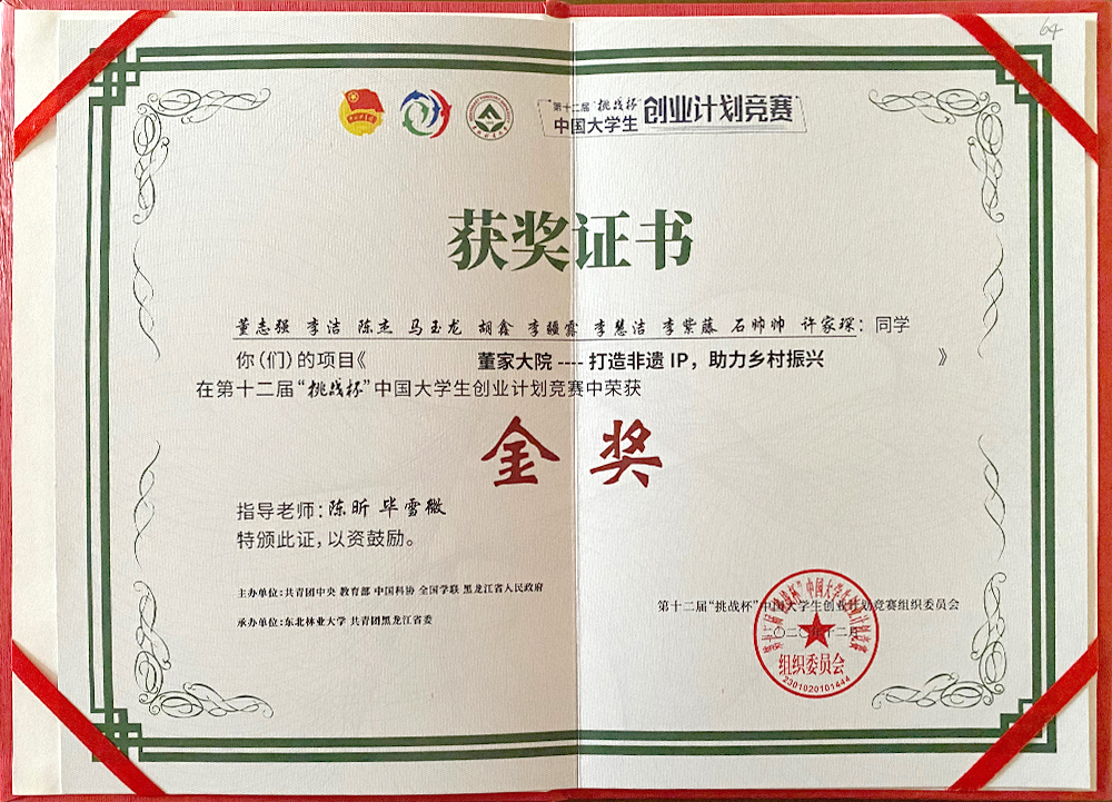 本届大赛充分发挥互联网的扁平化优势,以线上为主的形式举办全国决赛和各项交流活动。自6月启动以来,大赛共吸引全国2786所学校的17.9万个项目参赛。经过省级竞赛、国赛直通车、全国复赛等多轮选拔,共1400支学生团队参加全国决赛。经过激烈角逐,共评选出144项金奖。由陈昕、毕雪微老师指导的董志强等同学的项目《董家大院——打造非遗IP,助力乡村振兴》,获得乡村振兴和脱贫攻坚组金奖。同组高职院校金奖仅4项,我校也成为获得金奖项目的25所职业院校之一。