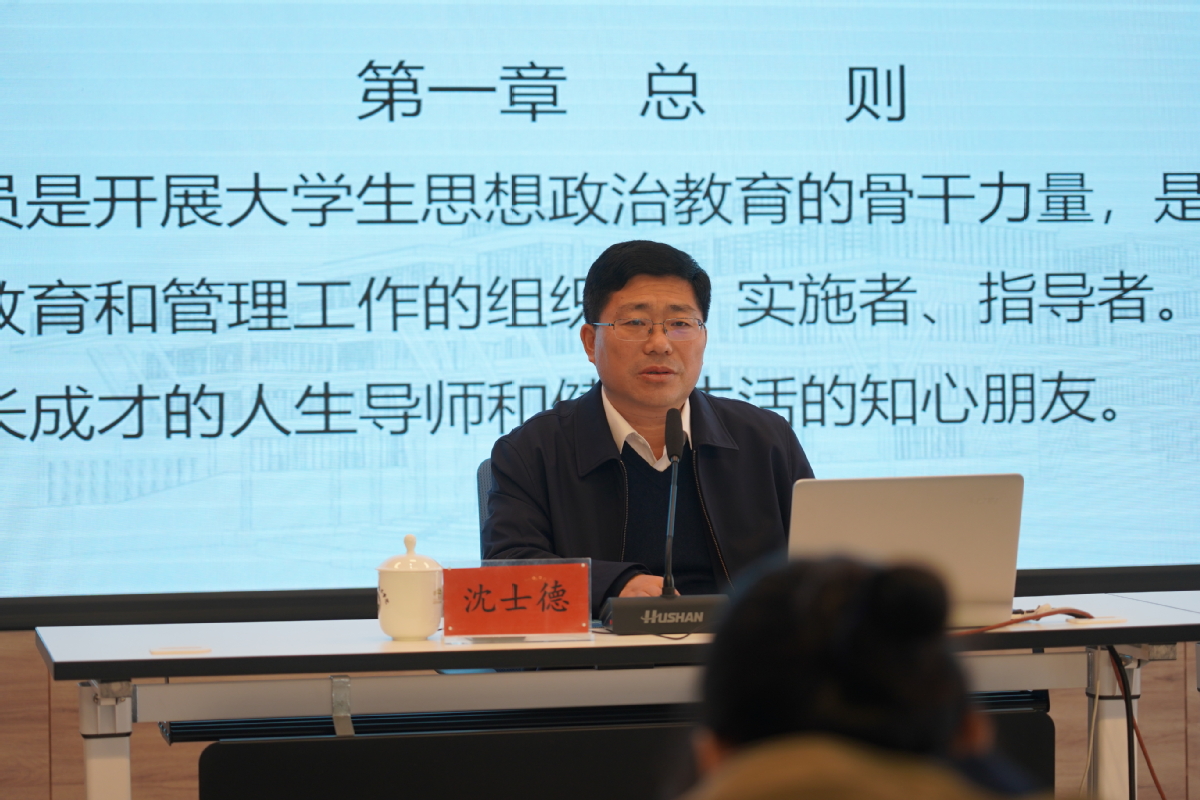 沈士德从辅导员是怎样的一个职业以及如何成为一名优秀的辅导员两个方面展开。他要求全体专职辅导员要做到:一要增强职业自信,从热爱到坚守;二要加强学习,掌握多学科知识和技能;三要关爱学生,做学生的良师益友;四要努力工作,坚持教育管理服务相结合;五要讲究方法,春雨育人细无声;六要注重研究,走专业化、专家化、职业化发展道路。他强调,教育工作的根本任务是培养社会主义建设者和接班人,作为与学生接触最多的教育者,广大辅导员要在六个方面下功夫,即坚定理想信念、厚植爱国主义情怀、加强品德修养、增长知识见识和培养奋斗精神。
