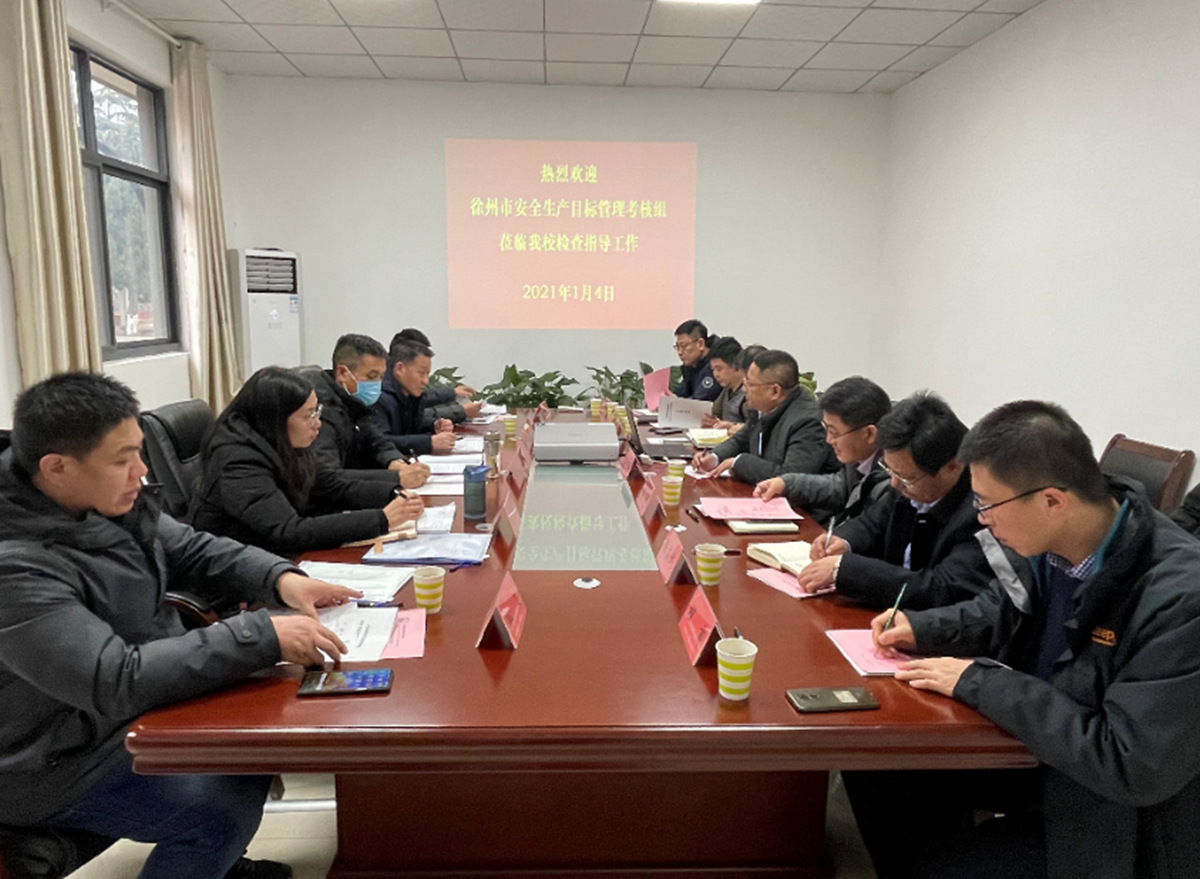 1月4日下午,徐州市安全生产目标第五考核组一行五人在市应急管理局副局长黄建忠的带领下,对我校2020年度安全生产工作进行考核。副院长蒋兆峰,学工处、保卫处、信息与网络中心、实验实训管理处、后勤管理服务中心负责同志参加考核。