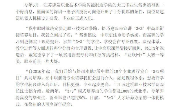 “我中职时就决定要走职业技术这条路,恰巧建院来宣讲‘3+3’中高职衔接培养项目,我就立刻报了名。”戴宪德说,中职更注重动手实操,而高职的学习则更侧重于理论提升。参加“3+3”的学生,学校会在专业设置、课程体系、教学过程等方面进行科学分段和合理设置,让中高职课程衔接更顺利。经过3年深造后,戴宪德拿下了一项实用新型专利和江苏省挑战杯、“互联网+”大赛一等奖,职业前景一片大好。