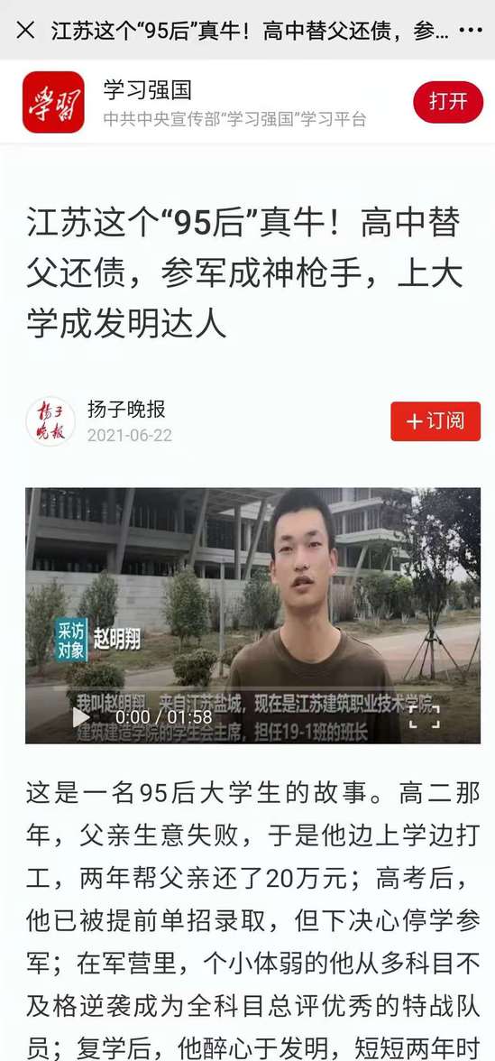 这是一名95后大学生的故事。高二那年,父亲生意失败,于是他边上学边打工,两年帮父亲还了20万元;高考后,他已被提前单招录取,但下决心停学参军;在军营里,个小体弱的他从多科目不及格逆袭成为全科目总评优秀的特战队员;复学后,他醉心于发明,短短两年时间里申请了42项专利……他叫赵明翔,是开云在线平台大二学生,在近日举行的第十一届“江苏省大学生年度人物”暨2021年“最美大学生”提名人选风采展评活动中,他获得了总评分第一名。