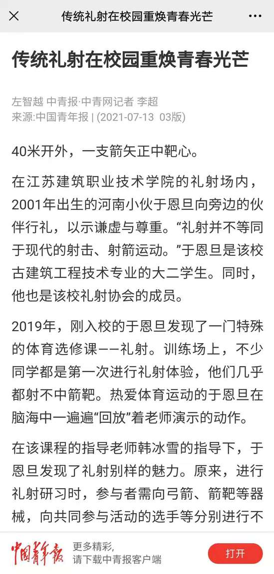 “礼射时,不能想前面到底射得好不好,要专注于当下。”该校电子商务专业大二学生朱慧说。在韩冰雪的指导下,于恩旦、朱慧进入礼射代表队,并在第4届中国大学生射箭(射艺)锦标赛上获得好成绩。