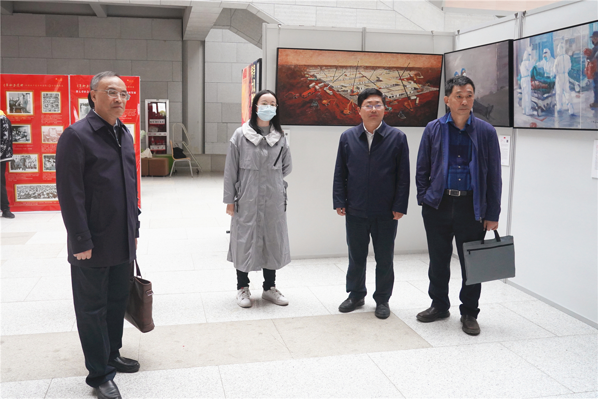 在现场调研环节,指导组一行首先观摩了图书馆举办的党史学习教育艺术文献展。整个展览分为“争取新民主主义革命的伟大胜利”“社会主义革命和建设时期”“改革开放和现代化建设新时期”“中国特色社会主义新时代”四大篇章,每一篇章又分设不同单元,形成总主题引领和不同单元展开的结构,通过“历时叙述”的展览语言,以画为体,以史为据,用40余幅精美的艺术作品,辅之以精当的美术点评和党史解读,艺术地再现了中国共产党100年来从无到有、从弱到强的伟大历程以及为国家和民族作出的伟大贡献,有力地激发起师生对党的丰功伟绩的崇高敬意。图书馆切实发挥文化中心作用,今年以“阅百年历程、传红色基因、铸精神力量”为主题,先后策划举办了庆祝建党100周年专题图书展、党史百年大家读、“革命与复兴”珍贵图像展等,厚植师生爱党爱国爱社会主义的情感。